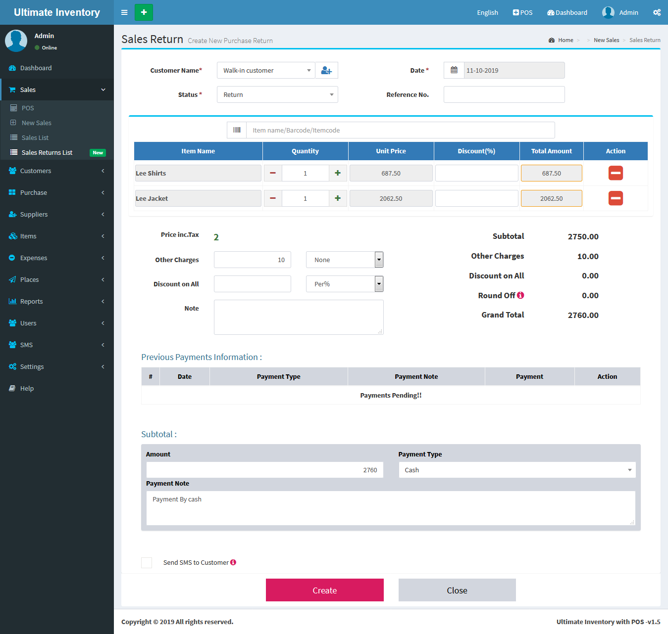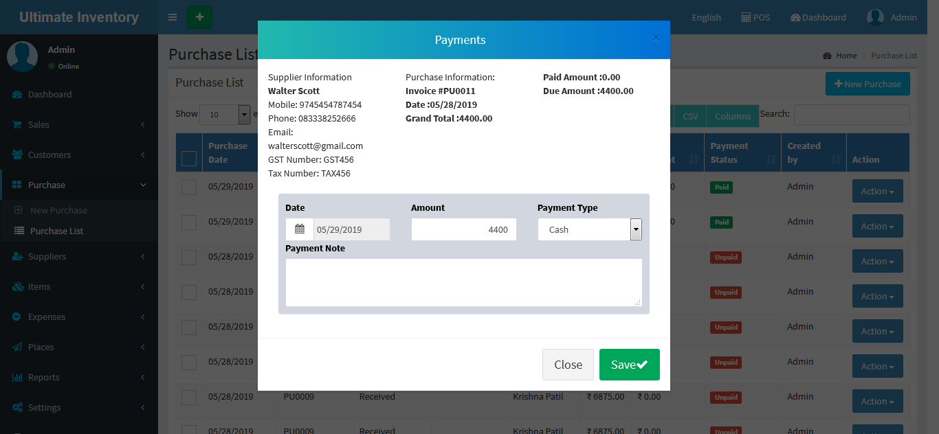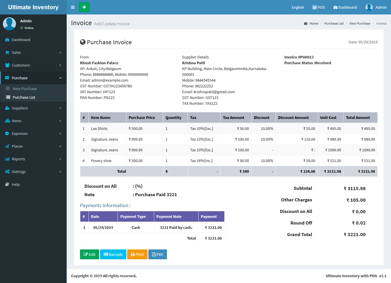 Inventory with POS is a web application software user can track Items & Stock Items, Manage Suppliers, Manage Customers, Items Categories, Sales, Purchase, Manage users and get all the reports which are require to your office and many more features.